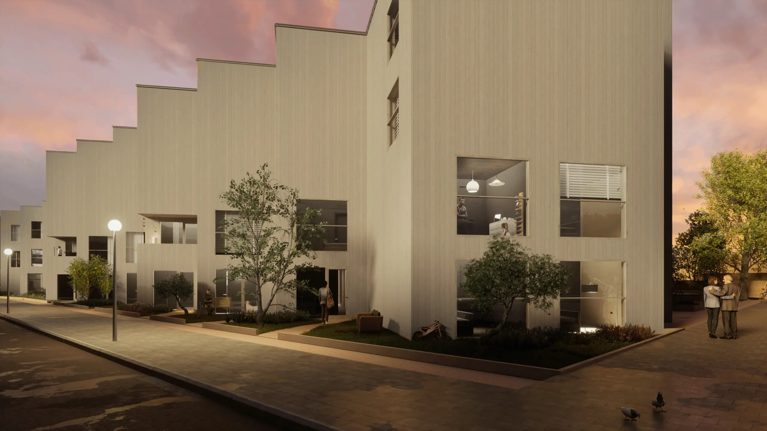 Op de kop van het gebouw zorgen commerciële ruimtes voor levendigheid en maken het complex een plek voor de hele buurt. De half verdiepte parkeerplaatsen zorgen voor natuurlijke ventilatie en zijn onzichtbaar vanaf de balkons. Boven de parkeerruimte ligt een groen park waar bewoners en buurtgenoten samen kunnen genieten.